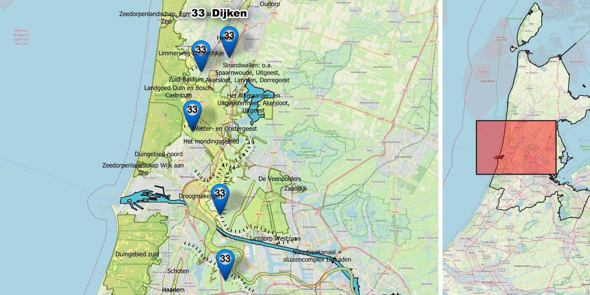 Lage natte gebieden kunnen alleen maar worden gebruikt als de waterstand geregeld kan worden. Om het water buiten de polders te houden werden er al vanaf de 11e eeuw dijken aangelegd (de oudste in het gebied is de Zanddijk tussen Bakkum en Limmen). Het kan gaan om lage dijkjes, ook wel kades genoemd, als hoge dijken die bescherming moesten bieden tegen de zee, die tot in de 19e eeuw via het IJ tot diep in het gebied doordringen. Dat leverde machtige dijken op zoals de Assendelver Zeedijk (Assendelft) en de Spaarndammerdijk (Spaarndam). Ook lagere dijken zoals de Korendijk (Castricum), St. Aagtendijk (Beverwijk/Heemskerk) zijn nog goed in het landschap te herkennen. Veel van deze binnendijken behoren nu tot grotere poldergebieden en zijn hun waterkerende functie kwijt, maar bestaan nog omdat er vaak wegen op aangelegd zijn. (watererfgoed)
