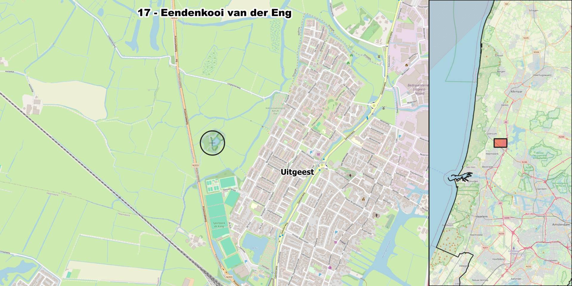 Eendenkooi Van der Eng, Uitgeest. Eendenkooien waren in vroegere eeuwen installaties om wilde eenden te vangen ‘voor de pot’. Een kooi bestaat uit een plas omringd door een bosje. Op de hoeken van de plas bevindt zich een vangpijp. Rond een kooi was een groot stiltegebied om de wilde eenden op de plas niet te verstoren. Ooit waren er 1000 kooien in Nederland, de meeste kooien zijn verdwenen, deze kooi is nog altijd vangklaar.